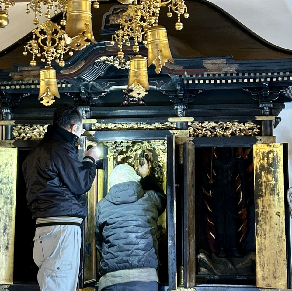 池田市教育委員会仏像調査 2026年2月 5日 境内 池田市の教育委員会による久安寺所在の仏像調査が月に一度、何ヶ月かに渡り、続いています。昨日は本堂の須弥壇。1000年前の定朝作の秘仏千手観音さま、毘沙門天さま、不動明王さまを調査していただきました。入念な調査、ありがとうございます。調査報告いただくのがとても楽しみです。